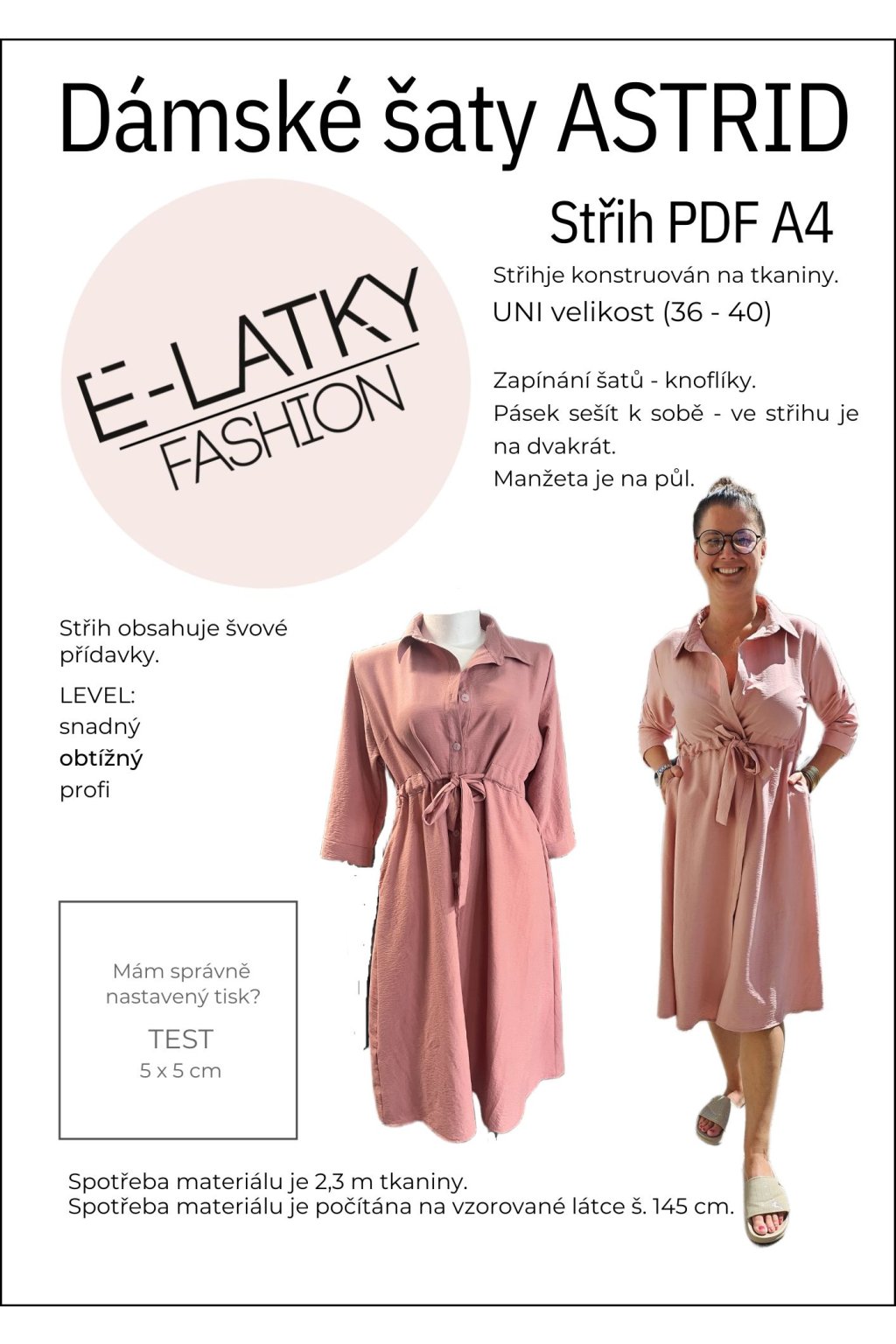 Střih pro dámské šaty Astrid, střih je konstruován na tkaniny. Šaty jsou velmi pohodlné a slušivé pro každou postavu, zapínání na knoflíky. Střih obsahuje švové přídavky. Pásek sešít k sobě - ve střihu je na dvakrát. Manžeta je na půl.