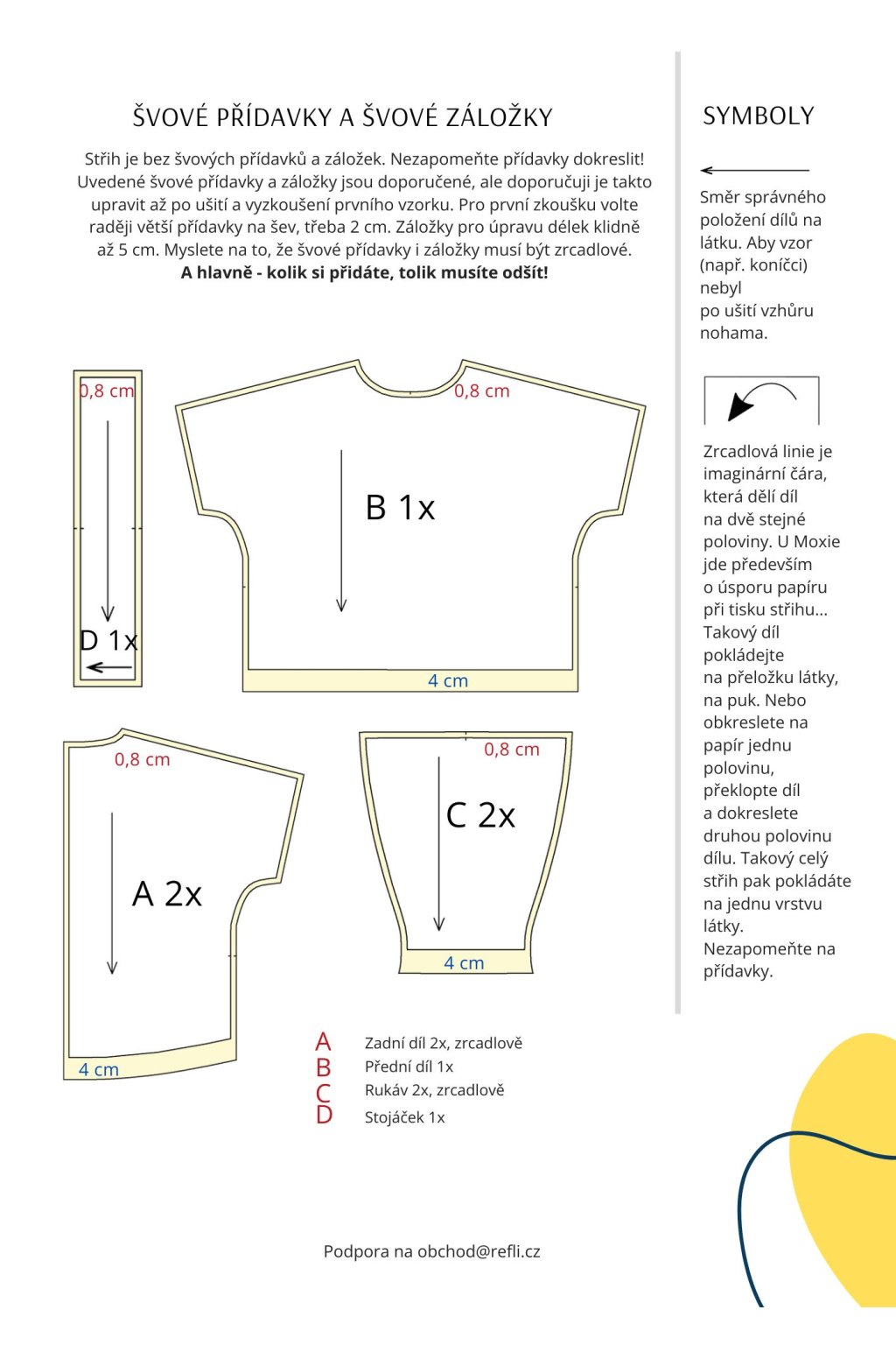 Střih je bez švových přídavků a záložek, nezapomeň je po vykreslení své velikosti doplnit, než stříhneš do látky. Mysli na to, že švové záložky musí být zrcadlové.
