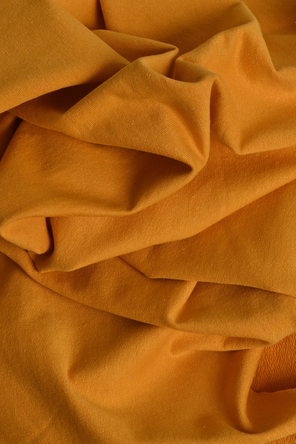 Nepočesaná teplákovina ve vyšší gramáží v barvě hořčice je příjemný, měkký a hladký materiál, který má z rubové strany charakteristická viditelná očka. Látka je pružná a je vhodným materiálem ke každodennímu nošení. Lze ji využít na legíny, kalhoty, tepláky, mikiny, šaty nebo tuniky.