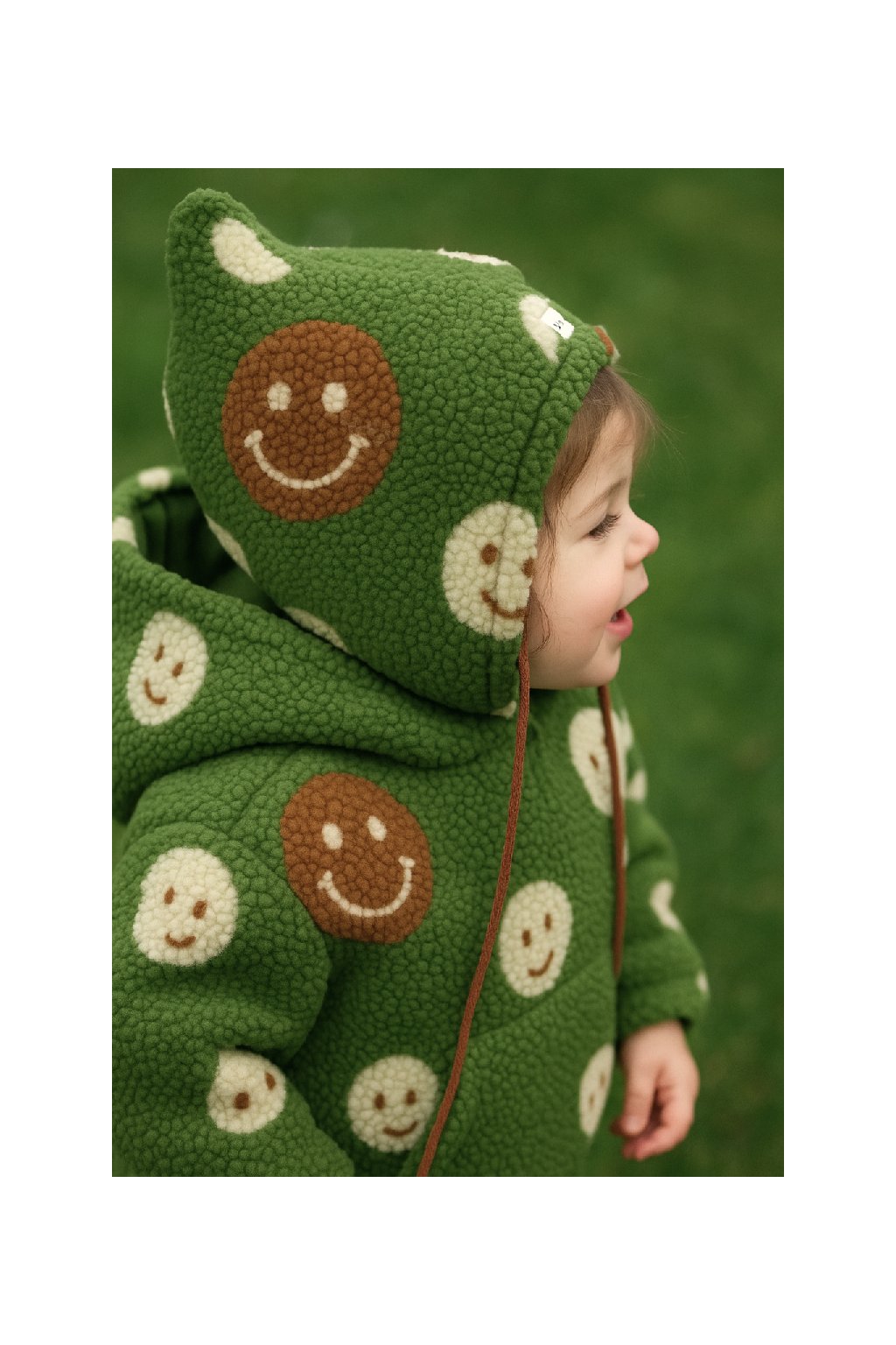 Kabátovina Teddy, která vás hřeje už od pohledu! Naprostý must have kousek do chladného počasí. Zachumlejte se do mikiny, tepláků, vesty, šály a nebo i do čepice či rukavic. Skvělé využití na dětské oblečení, ale nejen to! Motiv smajlíků na khaki podkladu.