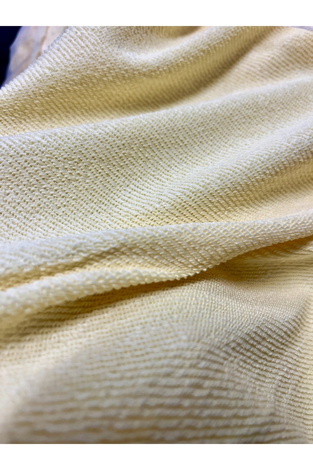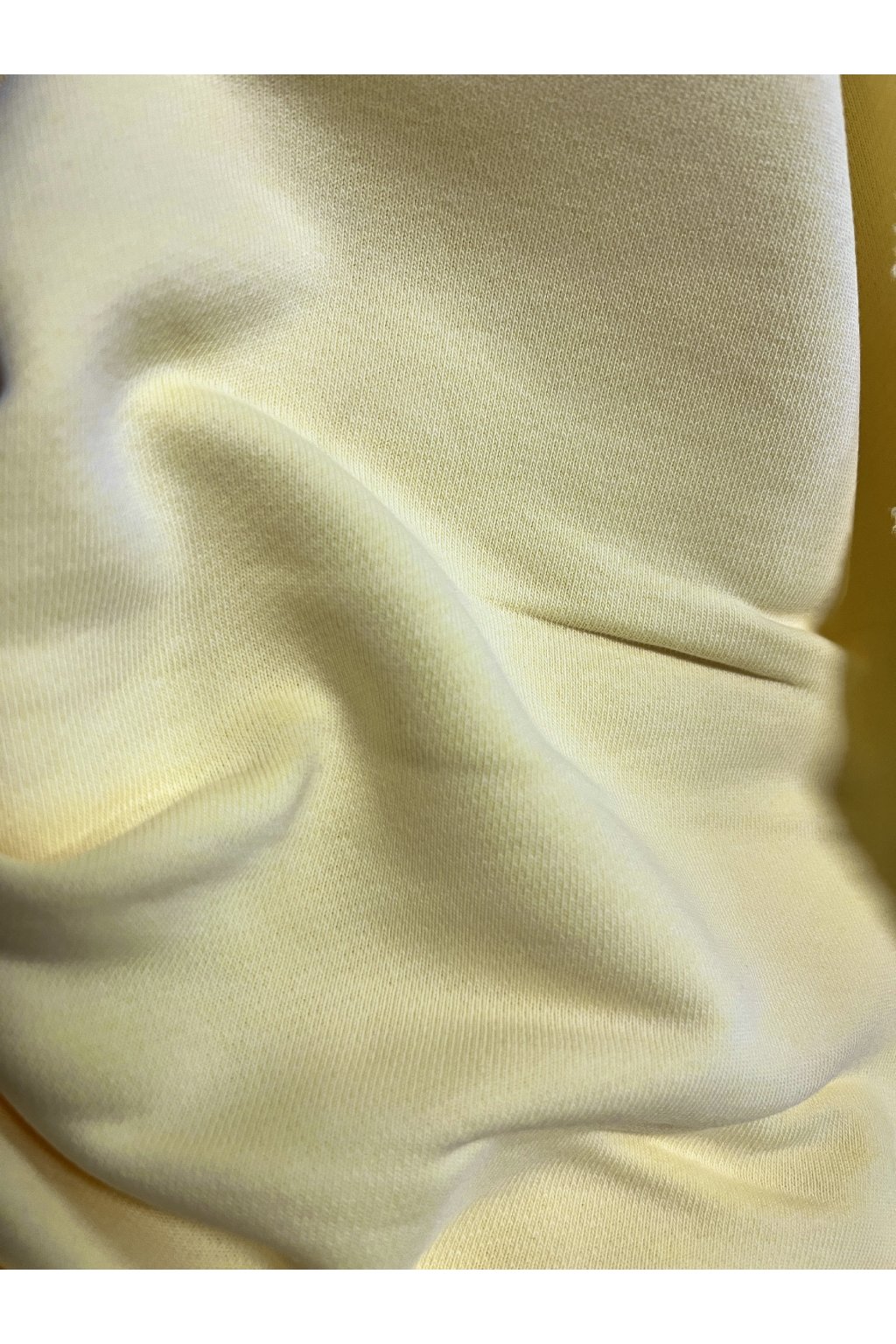 Speciální teplákovina vyvinutá od českého návrháře - omezené množství . Nepočesaná teplákovina ve vyšší gramáží v barvě pastelová žlutá je příjemný, měkký a hladký materiál, který má z rubové strany charakteristická viditelná očka. Látka je pružná a je vhodným materiálem ke každodennímu nošení. Lze ji využít na legíny, kalhoty, tepláky, mikiny, šaty nebo tuniky.